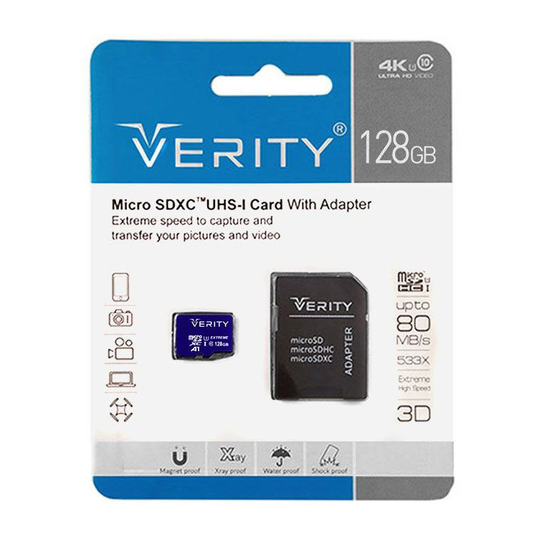 مموری Verity 533X-128GB UHS-1 Micro SDXC Card with Adapter یک مموری ساده و کوچک با ظاهری زیبا با سرعت U3 ( پرسرعت) بهره میبرد؛ بنابراین یک مموری بسیار سریع و مطمئن برای جا به جایی و ذخیره سازی فایلهای مهم شماست که با پورت USB 2.0 هم سازگاری کامل دارد این محصول در ظرفیتهای 16، 32 ، 64 ، 128 و 256 گیگابایتی ساخته شده است